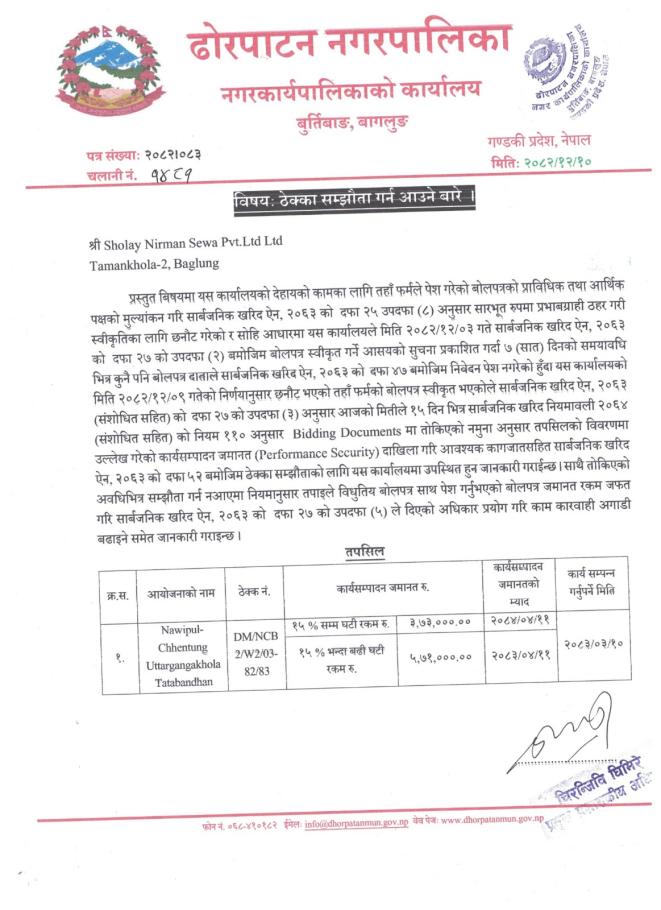 बोलपत्र स्वीकृत गर्ने आसयको सूचना ।