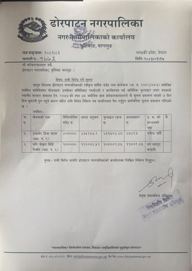 ढोरपाटन नगरपालिकाको आवधिक योजना तर्जुमा गर्नु पर्ने भएकोले सूची दर्ता गराउने सम्बन्धी सूचना ।