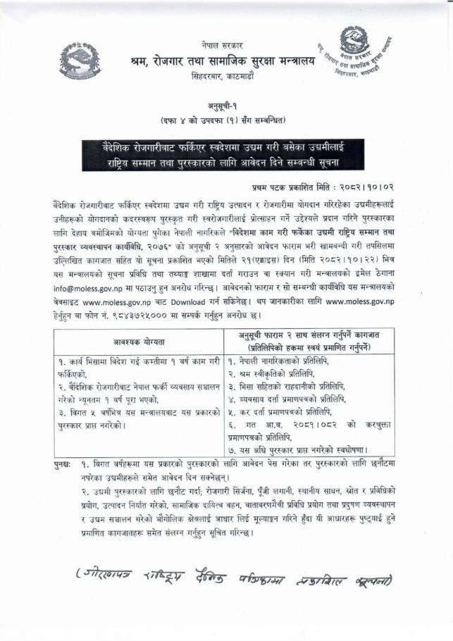 बैदेशिक रोजगारीबाट फर्किएर स्वदेशमा उद्यम गरी बसेका उद्यमीलाई राष्ट्रिय सम्मान तथा पुरुस्कारको लागि आवेदन दिने सम्बन्धी सूचना ।