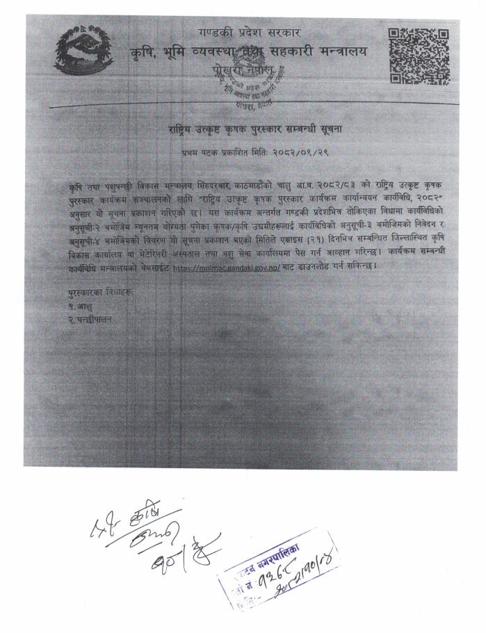 राष्ट्रिय उत्कृष्ट कृषक पुरस्कार सम्बन्धी सूचना ।
