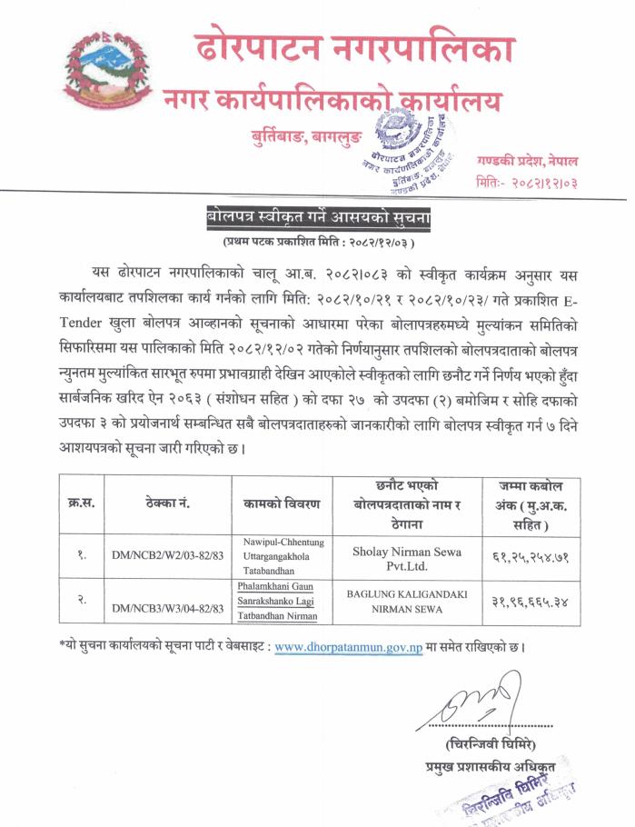 बोलपत्र स्वीकृत गर्ने आसयको सूचना ।